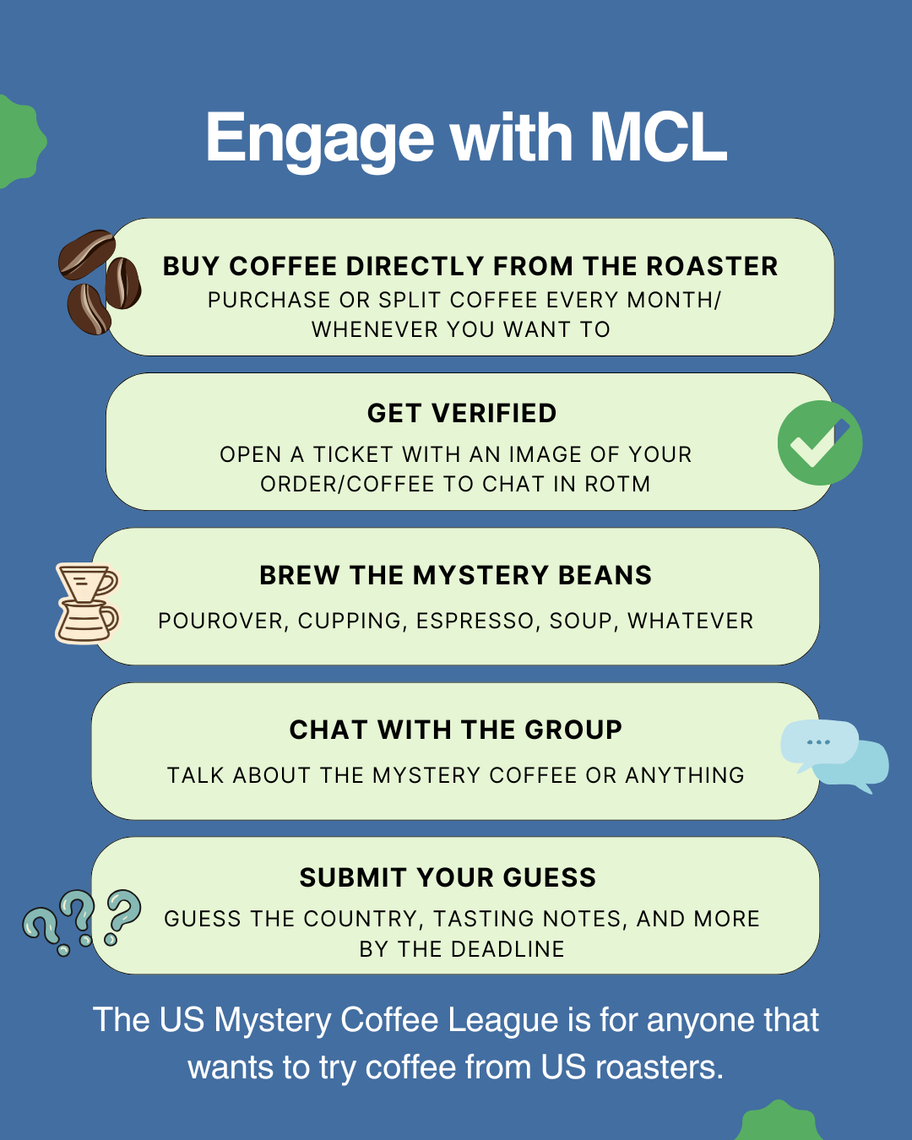 Once you have joined the Discord and bought the Mystery Coffee from the roaster, get verified by opening a ticket on the Mystery Coffee League discord with an image of your order. Once you are verified, you are all set! Submit guesses on the US Mystery Coffee League website and chat with fellow coffee lovers in Roaster of the Month (ROTM) chat.